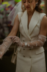 AJ arrived in a perfectly modern twist on groom’s wear: a sleek suit layered over a crisp white t‑shirt, finished with a statement brooch—one of the hottest groom accessories this year, y'all. Make room for brooches. We saw them on the red carpet in 2024 and they've continued to grace menswear ini 2025. It's only right grooms should embrace the brooch look too. Brianna complemented him in a chic sleeveless dress‑suit paired with playful matching bow‑tights and gloves, giving their look equal parts edgy editorial and romantic flair. She's the queen of bows and incorporating them into her civil ceremony outfit was such a fun idea.